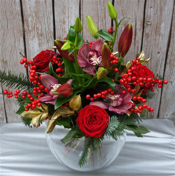 A beautiful bouquet that includes red naomi roses, red orchids, ilex, red lily and finished with fabulous aromatic Christmas foliage pine eucalytus and gold.