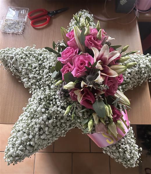 Beautiful 5 point star tribute 55 x 55cm based in dainty gypsophila and with floral arrangement in your choice of colours.