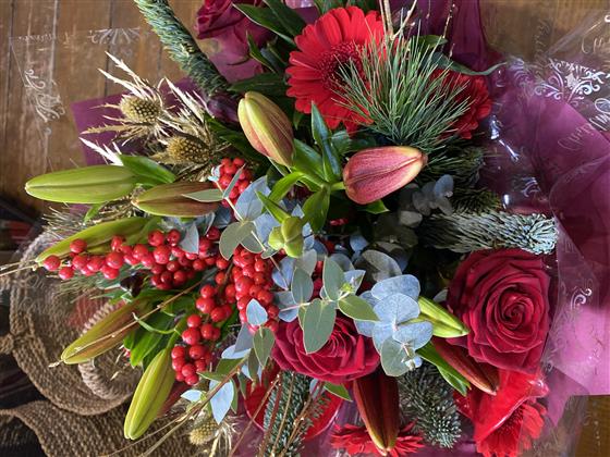 This beautiful bouquet includes red lily, red ilex berries, red mini anthuriums, red alstromeria, spray red roses and finished of with gold and natural euacalyptus and pinus.Large phot of Luxury size