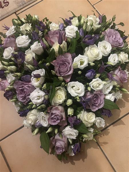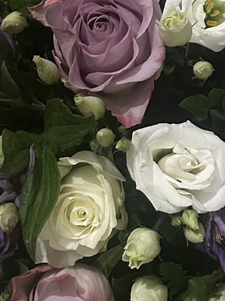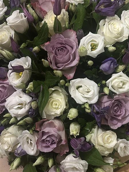 Lilac purple and white loose heart of mostly roses and lisianthus can be more purple if preferred, with seasonal filler flowers and foliage 17 in in photo and smaller version is 15 inches