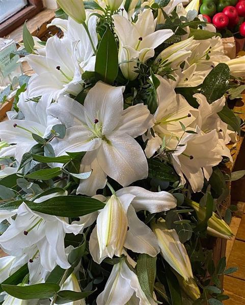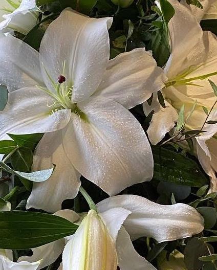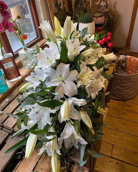 Stunning classic white oriental lily casket spray. Beautiful big headed lilies are used to create this timeless stunning tribute. Please not we need at least a weeks notice to prepare the lilies to open.