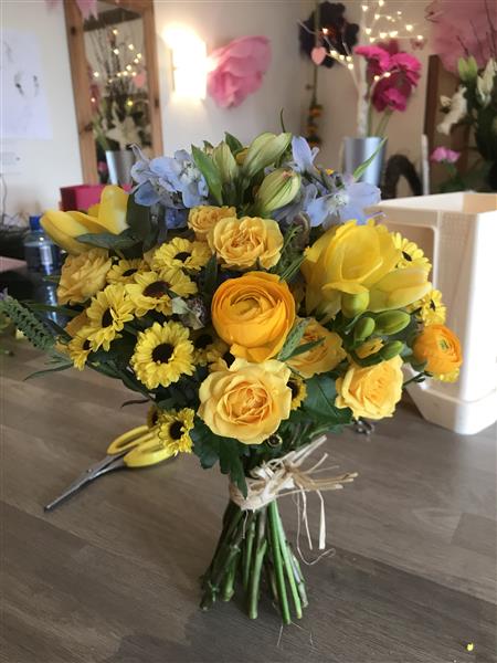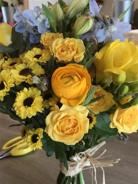 Lovely bright bouquet of blue delphiniums, yellow freesia and ranunculu, santini alstromeria and spray roses
